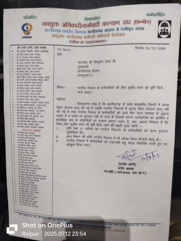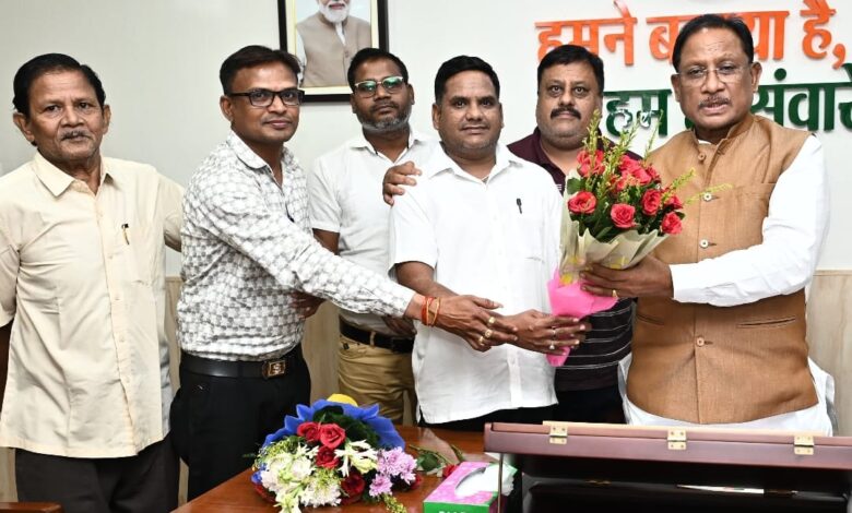 रायपुर – पूरे प्रदेश भर के नगरी निकाय कर्मचारी अपनी तीन सूत्री मूलभूत महत्वपूर्ण मांगों को लेकर लगातार पिछले एक सप्ताह भर से अपने-अपने स्थानीय निकायों में काली पट्टी लगाकर फील्ड और कार्यालयीन कार्यों को कर रहे थे और अपनी मांगों को लेकर नारा लगाते हुए आवाज बुलंद कर शासन का ध्यान अपनी ओर आकर्षित करने का लगातार प्रयास कर रहे थे। नवयुक्त अधिकारी कर्मचारी नगरी निकाय कल्याण संघ के प्रदेश अध्यक्ष राजेश सोनी ने बताया कि निकाय कर्मचारियों की बहुत ही महत्वपूर्ण और जमीनी स्तर की तीन मांगे जिसमें महीने के पहली तारीख को वेतन का भुगतान करने, शासन के अन्य विभागों की भांति पुरानी पेंशन योजना लागू करने, और समय पद पदोन्नति प्रदान करने जैसे गंभीर मुद्दों को लेकर हम लगातार संघर्षरत है और लगातार शासन को अपनी मांगों और समस्याओं को लेकर ध्यान आकर्षित करने के लिए प्रयास कर रहे थे इसी बीच शनिवार को मुख्यमंत्री निवास से संघ के पदाधिकारीयो को मुलाकात के लिए बुलावा आया था। संघ के प्रदेश पदाधिकारीयो द्वारा माननीय मुख्यमंत्री जी से उनके निवास में भेंट मुलाकात कर अपनी गंभीर और महत्वपूर्ण मांगों और समस्याओं से उनको अवगत कराया गया। जिस पर माननीय मुख्यमंत्री विष्णु देव साय जी द्वारा निकाय कर्मचारियों की समस्याओं को गंभीरता से लेते हुए अति शीघ्र मांगों पर विचार कर पूर्ण करने का आश्वासन दिया गया। श्री सोनी ने बताया कि चर्चा सकारात्मक और सार्थक रही और आने वाले समय पर निश्चित रूप से कर्मचारियों को इसका लाभ मिलेगा। मुख्यमंत्री से मुलाकात करने वाले में प्रमुख रूप से कर्मचारी संघ के संरक्षक संजय शर्मा, प्रदेश अध्यक्ष राजेश सोनी, प्रदेश महामंत्री सुभाष सोनकर, वरिष्ठ सलाहकार श्रवण ठाकुर, और कर्मचारी ललित साहू उपस्थित थे।