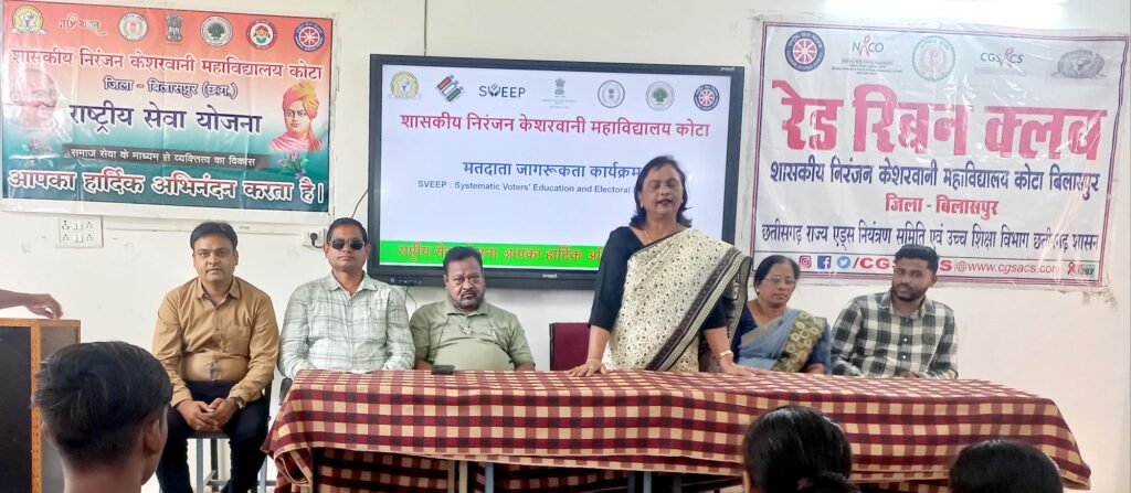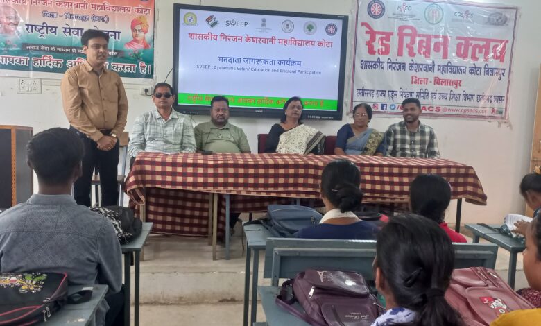 कोटा – कोटा विधानसभा की निर्वाचक नामावली में नये मतदाताओं के नाम जोड़ने एवं लोकतांत्रिक प्रक्रिया में मतदाताओं को वोट डालने के लिए प्रोत्साहित किये जाने हेतु अटल बिहारी वाजपेयी विश्वविद्यालय बिलासपुर से संबद्ध शासकीय निरंजन केशरवानी कालेज कोटा में दिनाँक 25.08.2025 को विशेष शिविर एवं मतदाता जागरूकता कार्यक्रम का आयोजन किया गया। तहसीलदार कोटा के निर्देशन में आयोजित इस विशेष शिविर में निर्वाचन शाखा प्रभारी, पटवारी, औरओ बी.एल.ओ. के द्वारा फॉर्म नंबर 6 भराकर कुल 82 नए मतदाताओं का नाम ऑनलाइन एवं ऑफलाइन जोड़ा गया। शिविर में नए मतदाताओं को सोशल मीडिया के द्वारा निर्वाचन आयोग के ऐप को फॉलो करने हेतु प्रेरित किया गया।