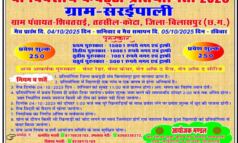 मनमोहन राजपूत (खैरा) कोटा विकासखंड अंतर्गत ग्राम पंचायत शिवतराई के आश्रित ग्राम सरईपाली में दो दिवसीय कबड्डी प्रतियोगिता का शुभारंभ आज से होगा। जिसमें जीतने वाले कबड्डी टीम को ₹15000 एवं ट्रॉफी से सम्मानित किया जाएगा।