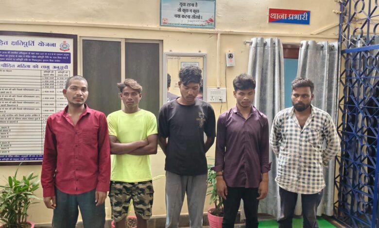 मौके पर पकड़े गए आरोपियों के नाम इस प्रकार हैं – शैलेन्द्र खुसरो पिता शिवनारायण खुसरो, उम्र 23 वर्ष, साकिन पडावपारा कोटा, राजा कश्यप पिता राममिलन, उम्र 29 वर्ष, साकिन बोईरखोली कोटा, प्रमोद ध्रुव पिता जनकराम ध्रुव, उम्र 25 वर्ष, साकिन देवरिहापारा कोटा, नारायण केंवट पिता भगत केवट, उम्र 31 वर्ष, साकिन देवरिहापारा कोटा, दुर्गेश निषाद पिता अर्जुन निषाद, उम्र 25 वर्ष, साकिन देवरिहापारा कोटा जिला बिलासपुर (छ.ग)