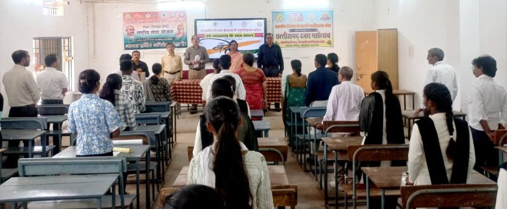 राजनीतिशास्त्र विभाग के डॉ. जे. के. द्विवेदी ने बतया कि वन्देमातरम भारत की सभ्यतागत, राजनीतिक और सांस्कृतिक चेतना का अभिन्न अंग बन चुका है. वरिष्ठ प्राध्यापक किशोर मिंज ने बताया कि आज इस महत्वपूर्ण अवसर को मनाना सभी भारतीयों के लिए एकता, बलिदान और भक्ति के शाश्वत संदेश को दोहराने का अवसर है. कार्यक्रम अधिकारी शितेष जैन ने जानकारी देते हुए बताया कि वन्देमातरम की पंक्तियाँ अमर राष्ट्रगीत के रूप में स्वतंत्रता सेनानियों और राष्ट्र निर्माताओं की अनगिनत पीढ़ियों को प्रेरित करती रही है और यह भारत की राष्ट्रीय पहचान और सामूहिक भावना का चिरस्थायी प्रतीक है. कार्यक्रम का संचालन अंग्रेजी विभाग के विभागाध्यक्ष डॉ शांतनु घोष के द्वारा किया गया. इस अवसर पर महाविद्यालय के सभी प्राध्यापक, अधिकारी, कर्मचारी, विद्यार्थी और राष्ट्रीय सेवा योजना के स्वयंसेवक उपस्थित थे।