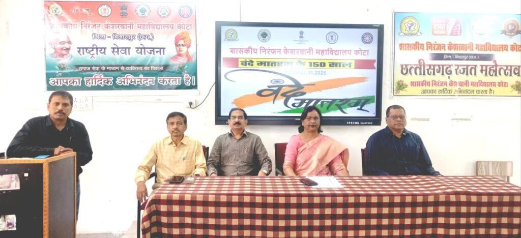 कोटा – अटल बिहारी वाजपेयी विश्वविद्यालय बिलासपुर से संबद्ध शासकीय निरंजन केशरवानी महाविद्यालय कोटा में राष्ट्रीय गीत वन्देमातरम के 150 वर्ष पूरे होने के उपलक्ष्य में विशेष परिचर्चा कार्यक्रम का आयोजन किया गया. इस अवसर पर प्रातः 10 बजे से दूरदर्शन के माध्यम से राष्ट्रीय स्तर पर आयोजित कार्यक्रम का सीधा प्रसारण विद्यार्थियों एवं समस्त स्टाफ के सम्मुख किया गया. कार्यक्रम में माननीय प्राधानमंत्री जी के संबोधन के पश्चात वन्देमातरम का सामूहिक गायन किया गया।