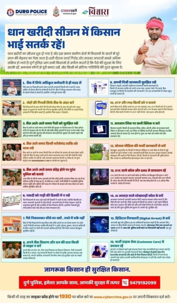 धान खरीदी का सीज़न शुरु हो गया है और इस समय ग्रामीण क्षेत्रों में किसानों के खातों में पूरे साल की मेहनत का पैसा आता है। इसी दौरान उठाई गिरोह और साइबर अपराधी सबसे अधिक सक्रिय हो जाते हैं। दुर्ग पुलिस आप सभी किसानों से अपील करती है कि पैसे की सुरक्षा के लिए सतर्क रहें, अनजान लोगों से दूरी बनाए रखें, और किसी भी संदिग्ध गतिविधि की तुरंत सूचना दें।