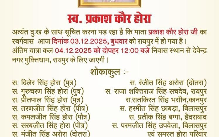 रायपुर – ग्रैण्ड ग्रुप के चेयरमेन गुरूचरण सिंह होरा की माता प्रकाश कौर होरा का आकस्मिक निधन बुधवार को हो गया है, उनकी अंतिम यात्रा 4 दिसंबर, गुरूवार को दोपहर 12 बजे उनके निवास स्थान से देवेन्द्र नगर मुक्तिधाम के लिए निकलेगी। वे सरदार दिलेर सिंह होरा, प्रीतपाल सिंह होरा की मां और तरणजीत सिंह, कमलजीत सिंह और सरबजीत सिंह होरा की दादी थी।