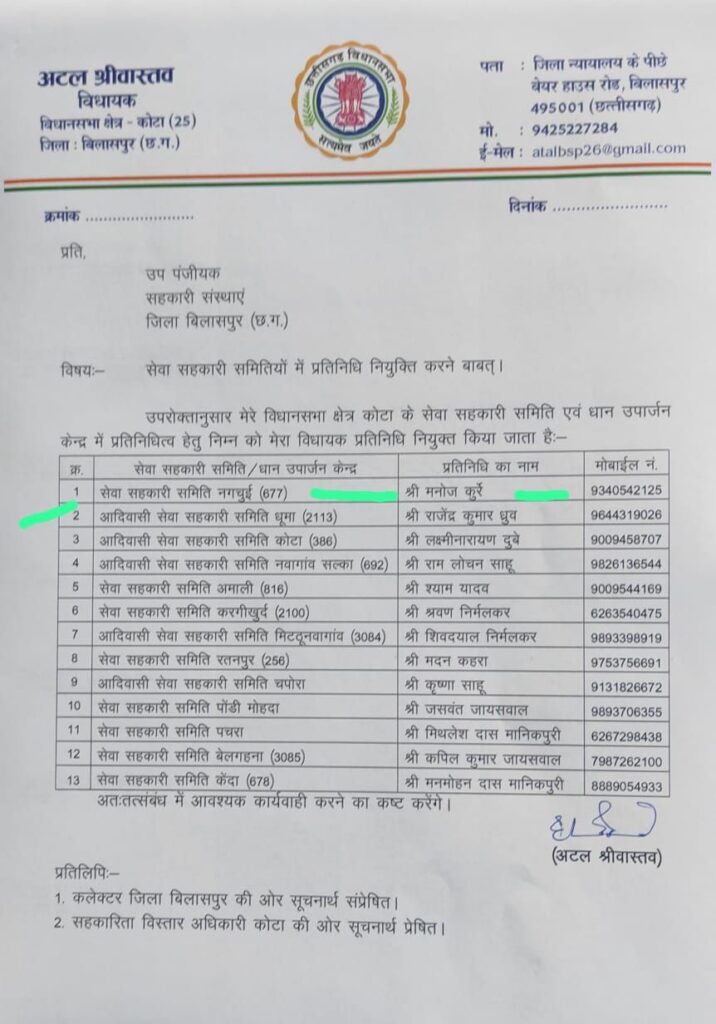 बिलासपुर – उप पंजीयक सहकारी संस्थाएं, जिला बिलासपुर (छत्तीसगढ़) द्वारा सेवा सहकारी समितियों एवं धान उपार्जन केन्द्रों में प्रतिनिधि नियुक्ति को लेकर आदेश जारी किया गया है। इसके तहत कोटा विधानसभा क्षेत्र की विभिन्न सेवा सहकारी समितियों एवं आदिवासी सेवा सहकारी समितियों में विधायक प्रतिनिधियों की नियुक्ति की गई है।