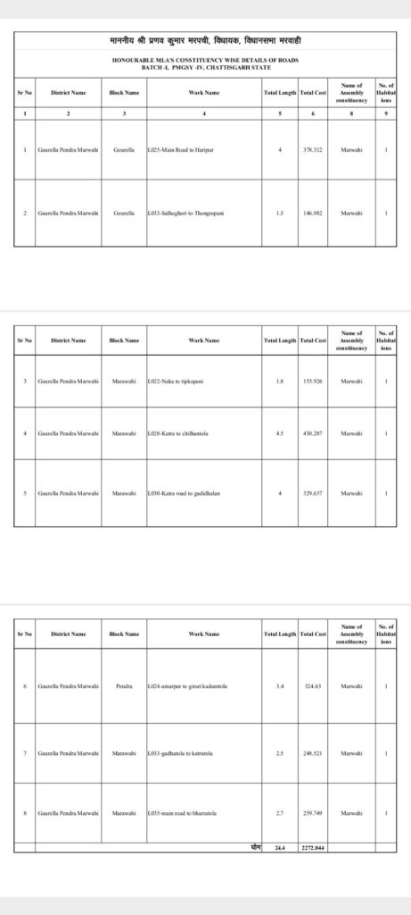 मरवाही विधायक प्रणव कुमार मरपच्ची ने बताया कि उनकी मांग पर प्रधानमंत्री ग्राम सड़क योजना के तहत मरवाही विधानसभा में मेन रोड से हरिपुर पहुंच मार्ग हेतु 378.312 लाख रुपए, साल्हेघोरि टेढ़गापानी पहुंच मार्ग हेतु 146.982 लाख रुपए, नाका से टिपका पानी , कटरा से चिल्हन टोला सहित कुल 8 प्रमुख ग्रामों की मुख्य सड़क निर्माण हेतु जिसकी कुल लंबाई 25 किलोमीटर सड़क के निर्माण हेतु 22 करोड़ रुपए से अधिक की मांग को स्वीकृति प्रदान की गई है, विधायक प्रणव कुमार मरपच्ची ने इस हेतु प्रदेश के विकास पुरुष मुख्यमंत्री विष्णुदेव साय उपमुख्यमंत्री विजय शर्मा एवं वित्त मंत्री ओपी चौधरी का आभार एवं धन्यवाद ज्ञापित किया है उन्होंने कहा कि मरवाही आदिवासी बहुलता वाली विधानसभा में इतनी बड़ी स्वीकृति से निश्चित ही गांव शहरों से जुड़ जायेगे जल्द ही विभाग द्वारा निविदा संबंधी कार्य हेतु प्रक्रिया पूर्ण करने के बाद जल्द ही निर्माण कार्य कराया जाएगा ।