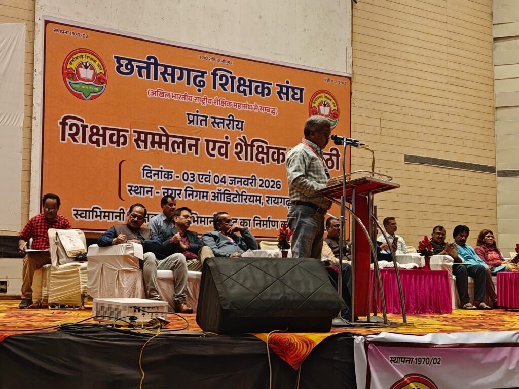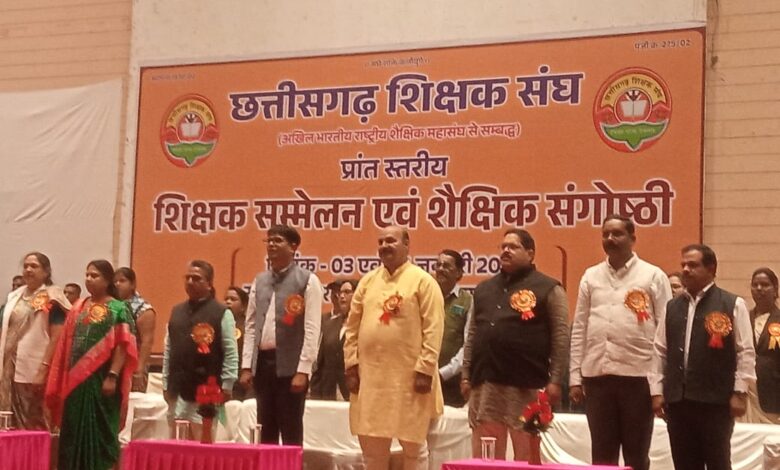 रायगढ़ – छत्तीसगढ़ शिक्षक संघ का प्रांतीय शिक्षक सम्मेलन एवं शैक्षिक संगोष्ठी रायगढ़ में 3 जनवरी एवं 4 जनवरी को शिक्षक संघ के चार पुरुषार्थों राष्ट्रीय हित, शिक्षा हित, शिक्षार्थी हित एवं शिक्षक हित की गौरवशाली परंपरा को आगे रखते हुए नगर निगम ऑडिटोरियम रायगढ़ में संपन्न हुआ । कार्यक्रम के प्रथम दिवस मां भारती की पूजा अर्चना, दीप प्रज्वलन के साथ कार्यक्रम का प्रारंभ हुआ। उद्घाटन सत्र में श्री नारायण जी नामदेव पालक अधिकारी शिक्षा एवं सह प्रांत प्रचारक राष्ट्रीय सेवक संघ छत्तीसगढ़ ने अपने विस्तृत विचार रखे । इस सत्र के प्रभारी कार्यकारी प्रांत अध्यक्ष उमेश भारती गोस्वामी जी रहे। द्वितीय सत्र के प्रभारी डॉक्टर अशोक कुमार गुप्ता प्रांतीय उपाध्यक्ष ने खुला मंच सत्र में विभिन्न जिले के शिक्षक प्रतिनिधियों के विचार आमंत्रित किये। जिसमें विभिन्न जिलों के 22 प्रतिनिधियों ने अपने-अपने विचार रखें। बिलासपुर जिले का प्रतिनिधित्व करते हुए शिवशंकर नामदेव ने सात बिंदुओं में अपने विचार रखे।