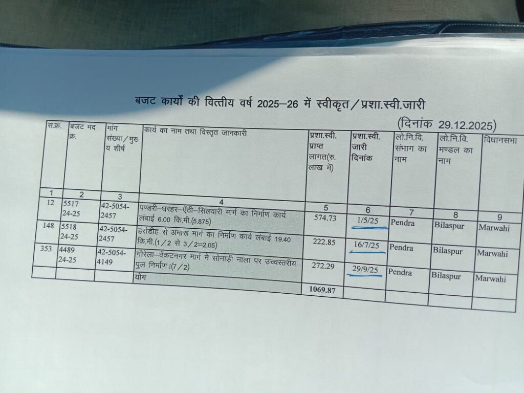 मरवाही विधायक प्रणव कुमार मरपच्ची ने बताया कि उनकी मांग पर छत्तीसगढ़ लोक निर्माण विभाग के द्वारा मरवाही विधानसभा में पंडरी-धरहर-ऐंठी-सिलवरी मार्ग के कुल लंबाई 6.00 किमी. सड़क निर्माण हेतु 574.73 लाख रुपए, हर्राडीह से आमारू पहुंच मार्ग निर्माण कार्य कुल लंबाई 2.05 किमी. सड़क निर्माण हेतु 222.85 लाख रुपए एवं गौरेला से वेंकटनगर मार्ग पर सोनाड़ी नाला पर उच्च स्तरीय पुल निर्माण हेतु 272.29 लाख रुपए की प्रशासकीय स्वीकृति प्रदान की गई है!