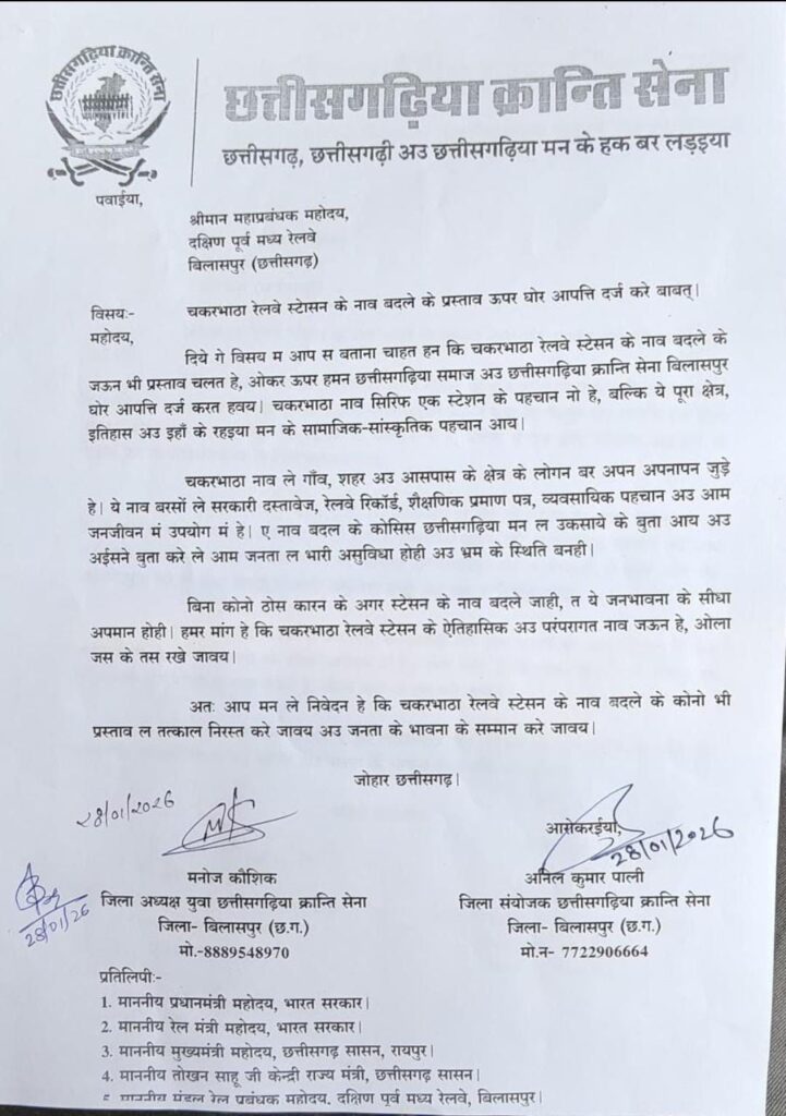 संगठन के पदाधिकारी मनोज कौशिक ने चेतावनी दी कि यदि चकरभाठा रेलवे स्टेशन का नाम बदलने का निर्णय वापस नहीं लिया गया, तो छत्तीसगढ़िया क्रान्ति सेना जनआंदोलन करने को बाध्य होगी। साथ ही यह भी स्पष्ट किया गया कि किसी भी स्थिति में स्थानीय पहचान के साथ छेड़छाड़ बर्दाश्त नहीं की जाएगी।