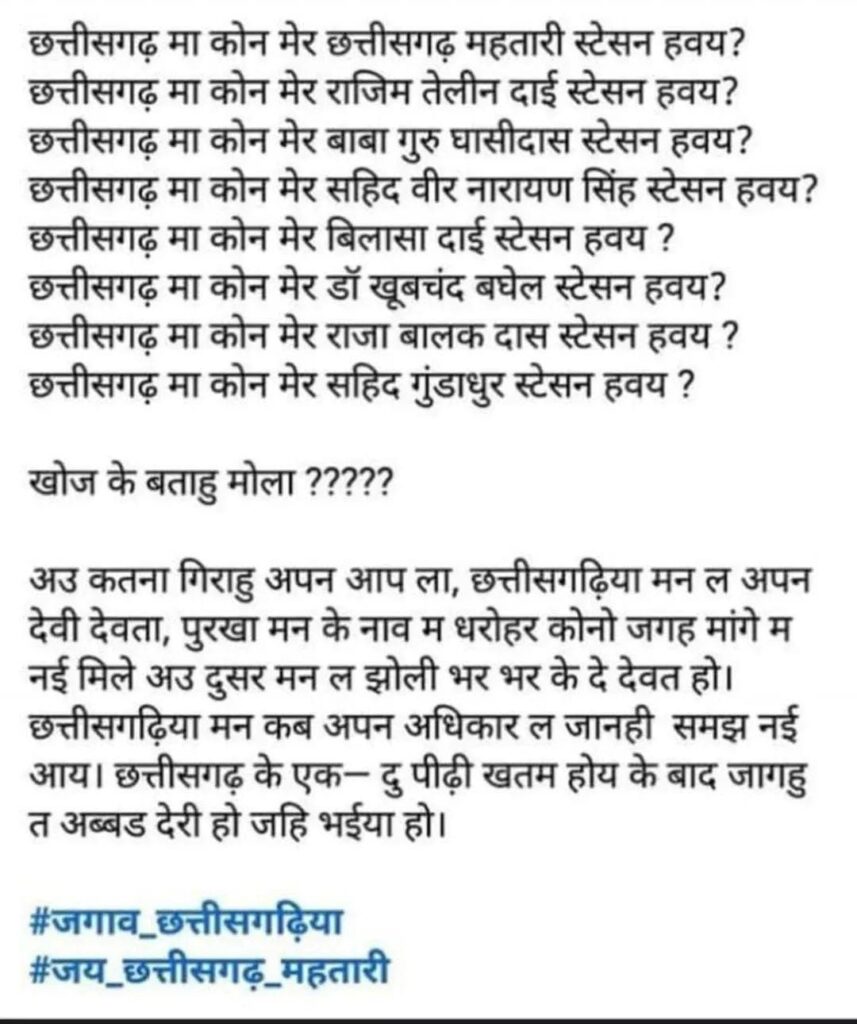 छत्तीसगढ़िया क्रान्ति सेना के जिला उपाध्यक्ष संजू भोयरा ने कहा कि छत्तीसगढ़ के मंत्री छत्तीसगढ़िया पुरखा का अपमान कर रहें है, जहाँ छत्तीसगढ़ के पुरखों के रखे चौक, तालाबों के नाम को परिवर्तन किया जा रहा है उसी प्रकार अब रेलवे स्टेशन के नाम को बदलने की साजिश की जा रही है।