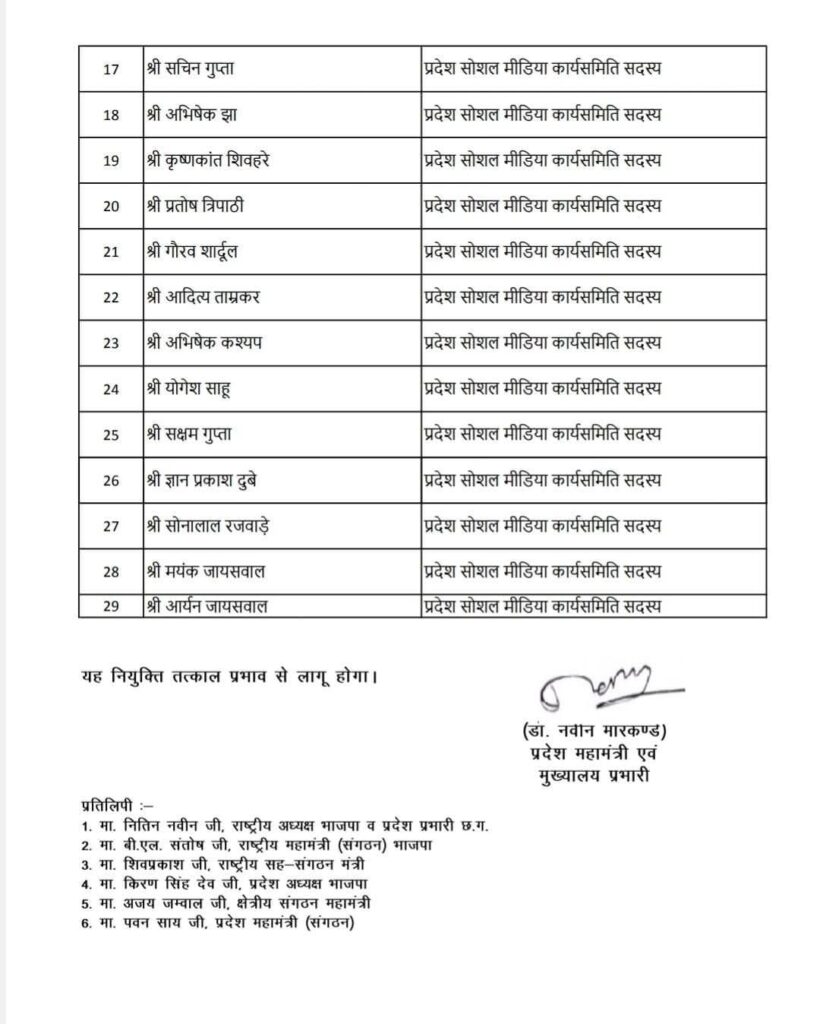 रायपुर – भारतीय जनता पार्टी के प्रदेश अध्यक्ष श्री किरण देव साय की सहमति से भाजपा सोशल मीडिया छत्तीसगढ़ की प्रदेश कार्यसमिति की घोषणा कर दी गई है। यह आदेश प्रदेश कार्यालय से दिनांक 03 फरवरी 2026 को जारी किया गया।