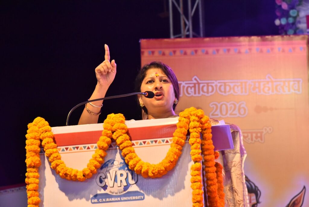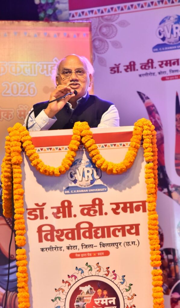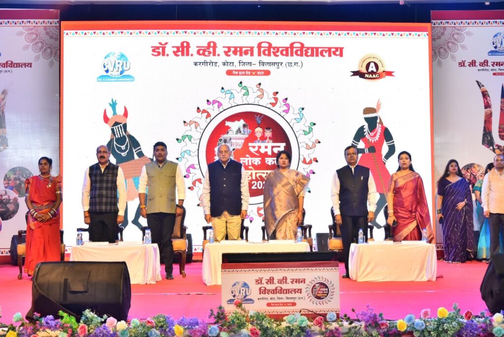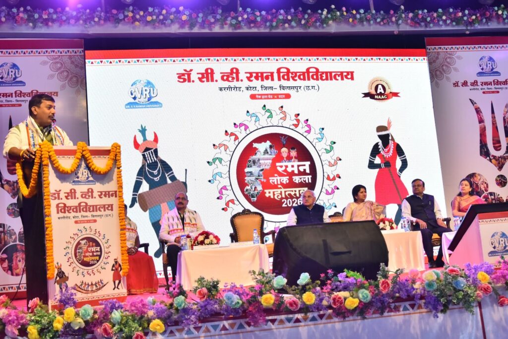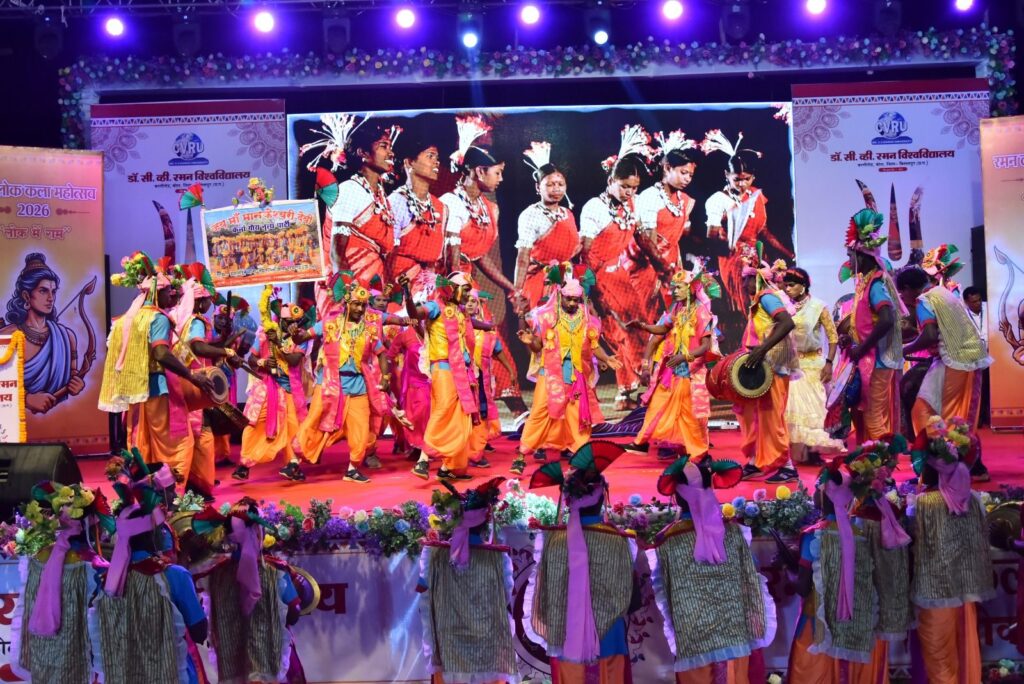 बिलासपुर – छत्तीसगढ़ की सांस्कृतिक राजधानी बिलासपुर स्थित डॉ. सी. वी. रमन विश्वविद्यालय में चार दिवसीय ‘रमन लोक कला महोत्सव’ का भव्य शुभारंभ हुआ। 13 से 16 फरवरी तक आयोजित इस महोत्सव की थीम “लोक में राम” रखी गई है। महोत्सव के पहले दिन देश के विभिन्न राज्यों से आए लोक कलाकारों ने भगवान राम के जीवन पर आधारित प्रस्तुतियों से वातावरण को भक्तिमय और लोकमय बना दिया।