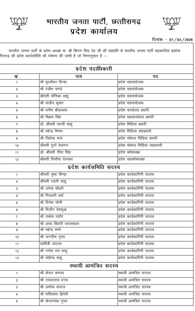 बिलासपुर – भाजपा के प्रदेश अध्यक्ष किरण सिंह देव और संगठन मंत्री पवन साय के मार्गदर्शन तथा सहकारिता प्रकोष्ठ के प्रदेश संयोजक प्रवीण कुमार दुबे द्वारा बिलासपुर की समाजसेवी डॉ. गीता सिंह को सहकारिता प्रकोष्ठ में प्रदेश कोषाध्यक्ष की महत्वपूर्ण जिम्मेदारी सौंपी गई है। उनकी इस नियुक्ति से संगठन के कार्यकर्ताओं और महिलाओं में खुशी की लहर देखी जा रही है।