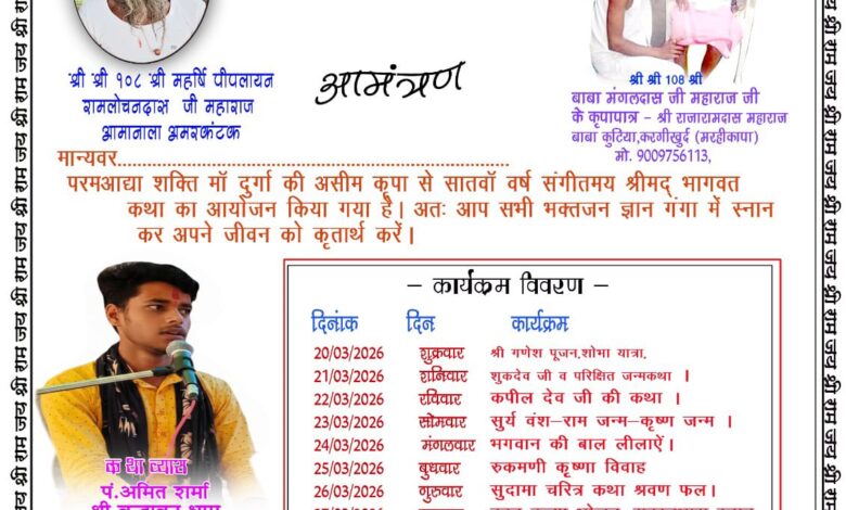 उन्होंने यह भी जानकारी दी कि आगामी गंगा दशहरा पर्व पर अमानाला, अमरकंटक में भी बाबा कुटिया की ओर से श्रीमद् भागवत कथा का आयोजन किया जाएगा, जिसमें पंडित अमित शर्मा जी द्वारा कथा वाचन किया जाएगा।