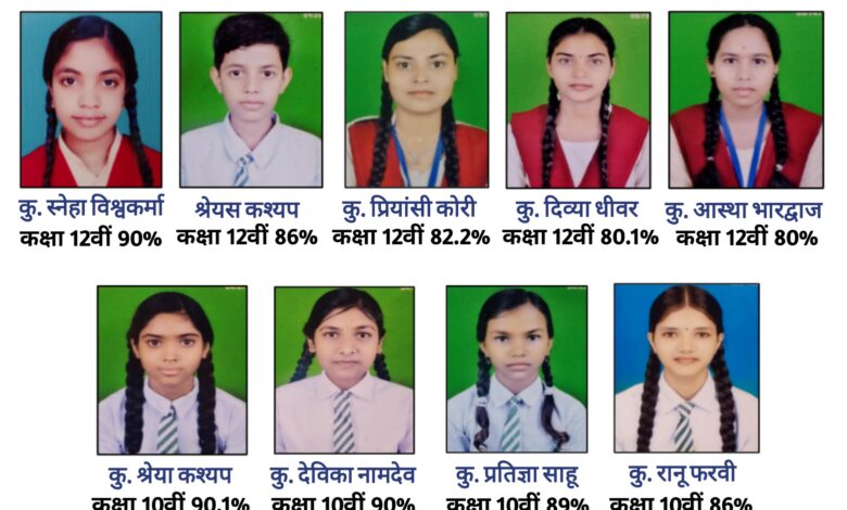 इसी तरह कक्षा 10वीं में कु. श्रेया कश्यप ने 91 प्रतिशत अंक प्राप्त कर प्रथम स्थान हासिल किया। कु. देविका नामदेव 90 प्रतिशत के साथ द्वितीय और कु. प्रतिज्ञा साहू 89 प्रतिशत अंक प्राप्त कर तृतीय स्थान पर रहीं।
